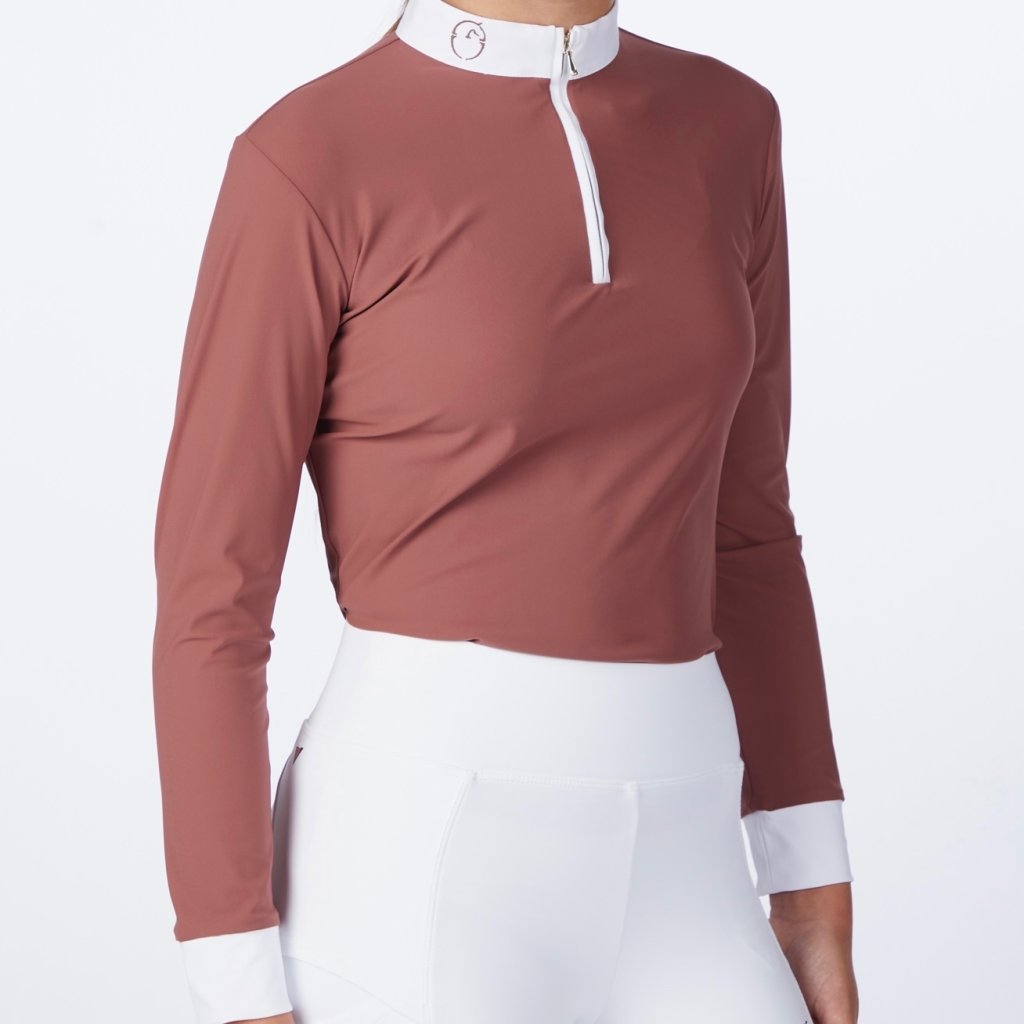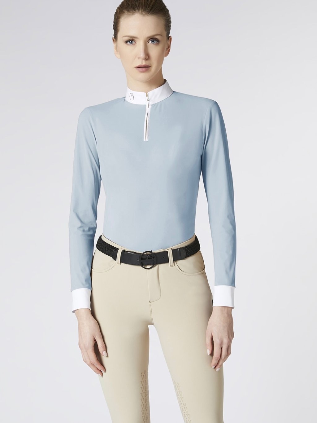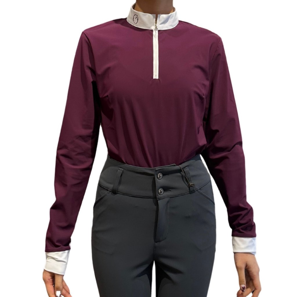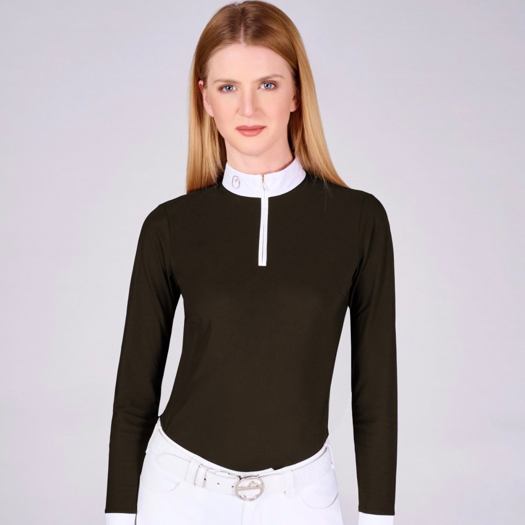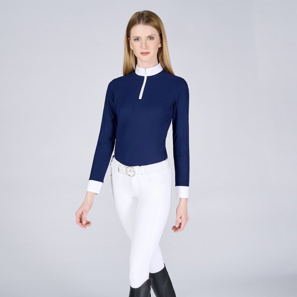 Women’s competition shirt Mahon is designed for competition in any wether conditions with the best comfort. Light and breathable bistretch materials, comfortable fit. Long sleeve, stand up collar in popeline with embroidered logo. Fancy golden front zip.