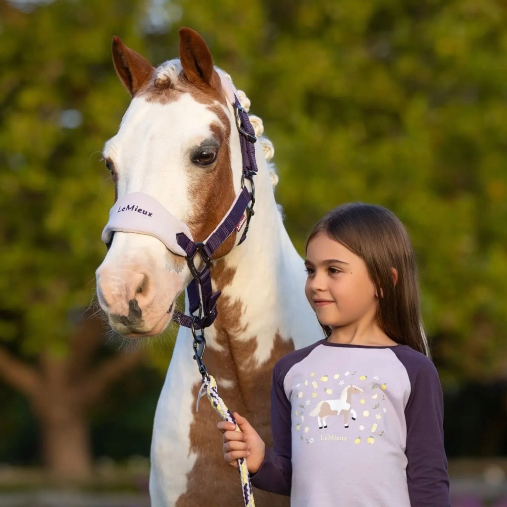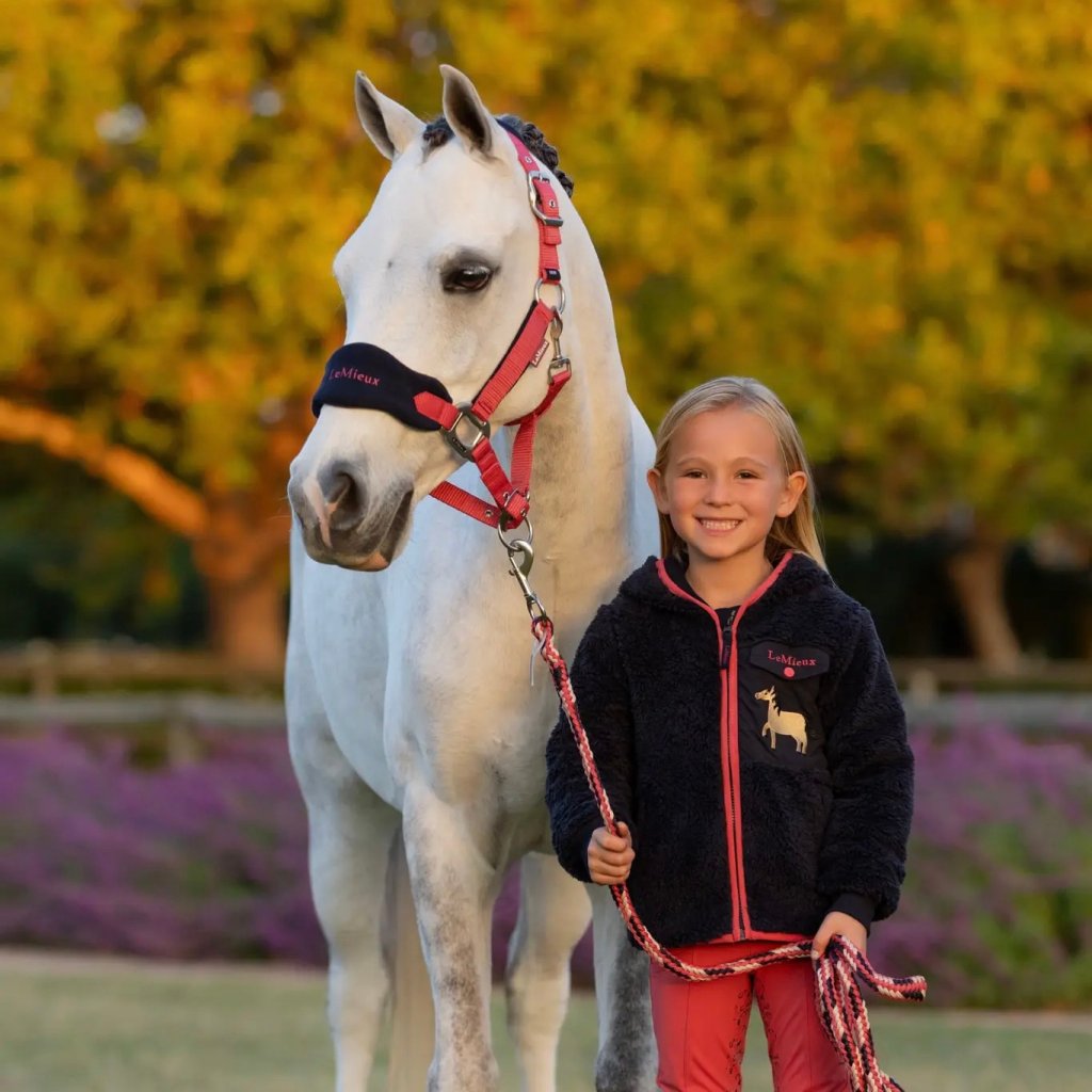 At last a premium designer collection for Kids! Mini LeMieux is intended to appeal to the under twelves with an eye for style. Designed particularly for 11.2hh to 13hh ponies, the Mini Vogue Headcollar is a lovely soft headcollar featuring fleece inserts at the poll strap and nose band. These fleece inserts ensure even pressure distribution and are fitted with extra padding for greatest possible wearing comfort. Cheek straps are lined with fleece. Multi adjustable at the curb and poll strap (adjustable from both sides)