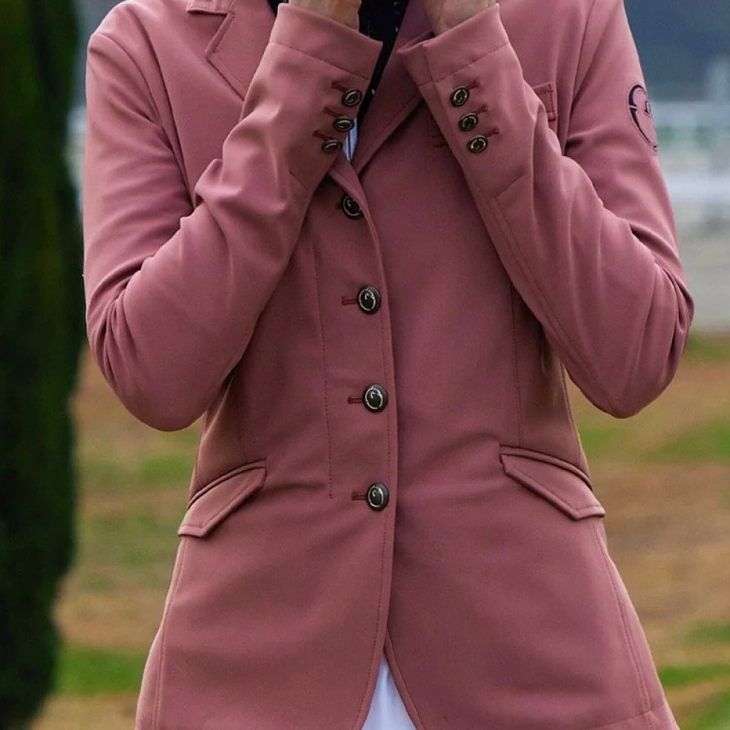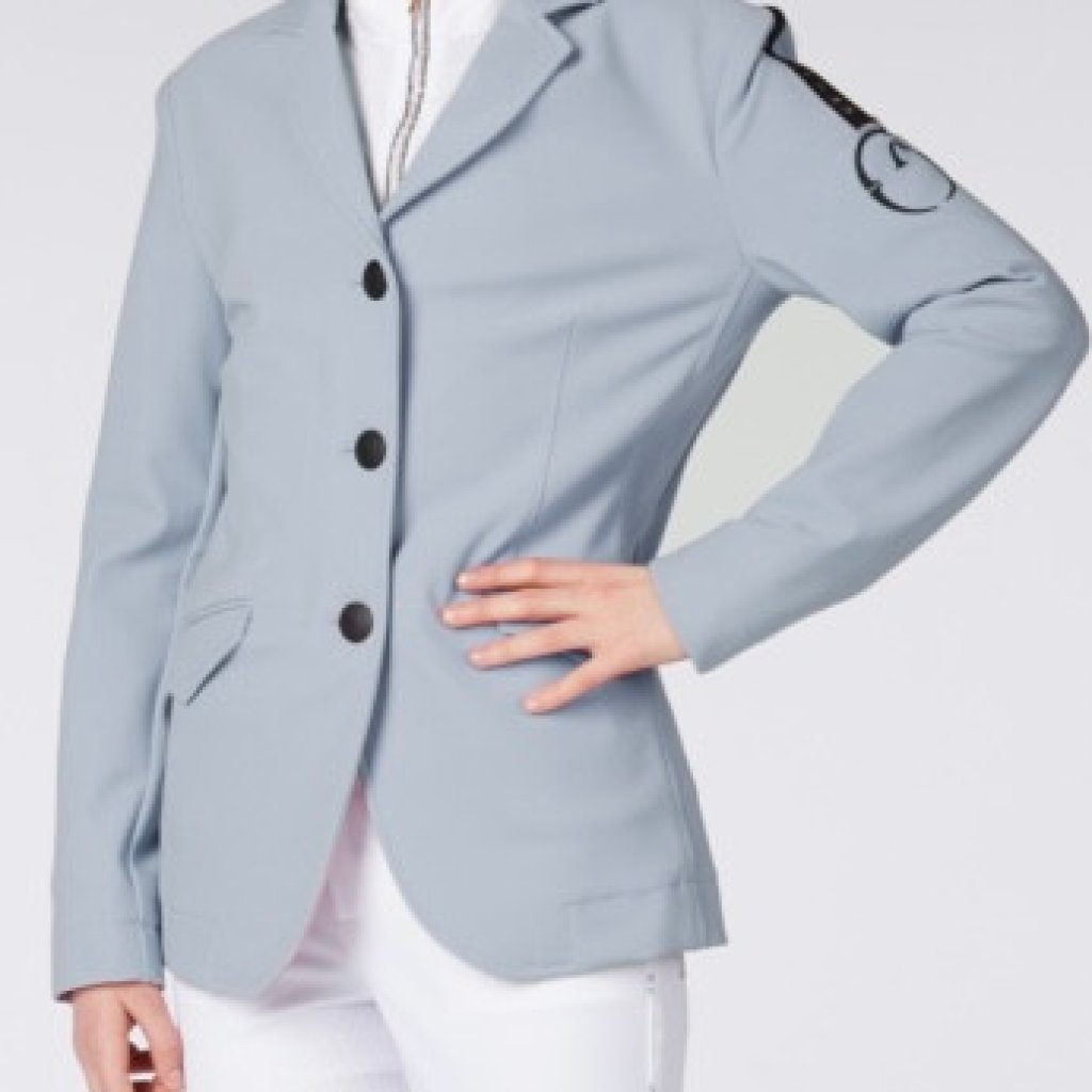 The unlined competition Parma jacket for girls is made of TK fabric, a bi-elastic fabric that is lightweight and provides greater comfort in movement. On the left sleeve there is a heat-sealed scuba application, black buttons and flap pockets on the front.