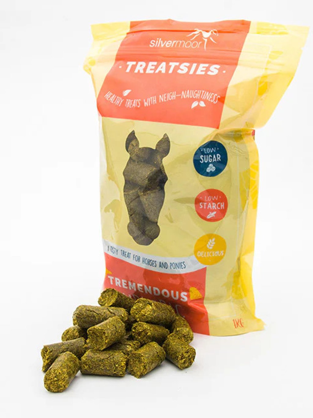 Silvermoor Treatsies 1 kg Turmeric Flavor for Horses and Ponies. Low-sugar and low-starch treats, rich in fiber and made with high-quality natural ingredients. They contain turmeric, with anti-inflammatory and antioxidant properties, ideal for joints and stiffness, and beneficial for your horse's skin and coat. Delicious and healthy at the same time.